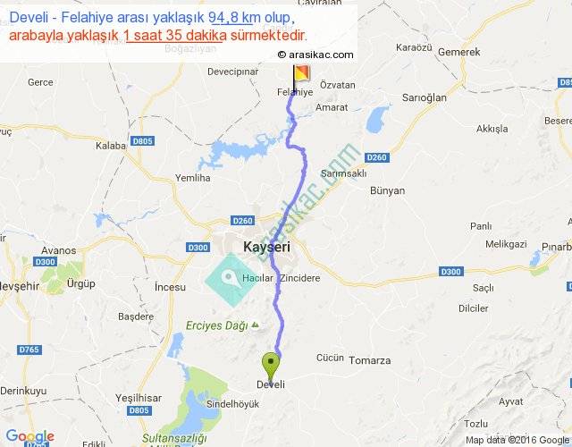 Develi - Felahiye arası yaklaşık olarak 90 km/h ile yukarıda belirtilen sürede olup, iki yerin kuş uçuşu uzaklığı (mesafesi) 78'dir. Yolculuk otobüsle 2 saat 3 dakika sürmektedir.