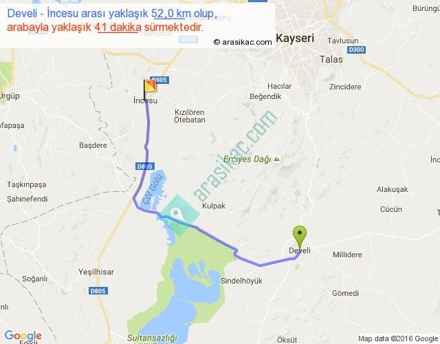 Develi - İncesu arası yaklaşık olarak 90 km/h ile yukarıda belirtilen sürede olup, iki yerin kuş uçuşu uzaklığı (mesafesi) 37'dir. Yolculuk otobüsle 53 dakika sürmektedir.