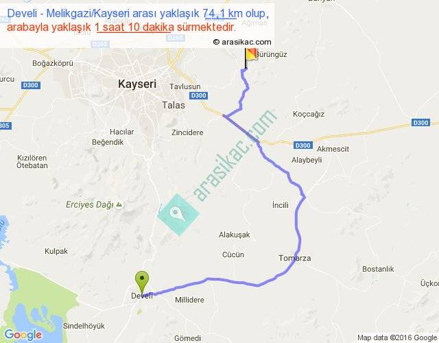 Develi - Melikgazi Kayseri arası yaklaşık olarak 90 km/h ile yukarıda belirtilen sürede olup, iki yerin kuş uçuşu uzaklığı (mesafesi) 43'dir. Yolculuk otobüsle 1 saat 31 dakika sürmektedir.