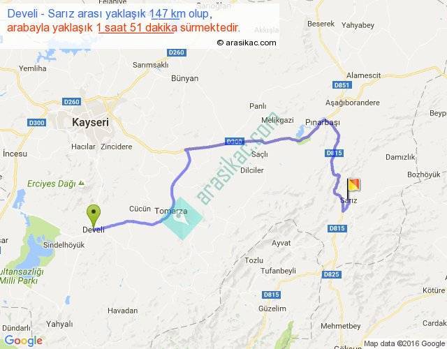 Develi - Sarız arası yaklaşık olarak 90 km/h ile yukarıda belirtilen sürede olup, iki yerin kuş uçuşu uzaklığı (mesafesi) 88'dir. Yolculuk otobüsle 2 saat 24 dakika sürmektedir.