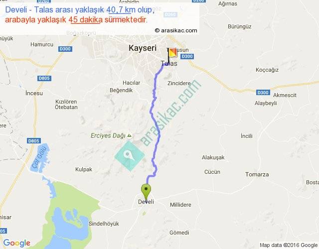 Develi - Talas arası yaklaşık olarak 90 km/h ile yukarıda belirtilen sürede olup, iki yerin kuş uçuşu uzaklığı (mesafesi) 33'dir. Yolculuk otobüsle 58 dakika sürmektedir.
