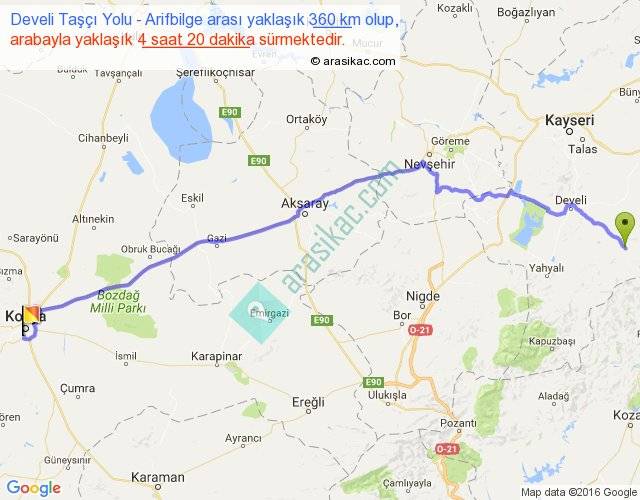Develi Taşçı Yolu - Arifbilge arası yaklaşık olarak 90 km/h ile yukarıda belirtilen sürede olup, iki yerin kuş uçuşu uzaklığı (mesafesi) 291'dir. Eğer belirtilen yerler arasında uçak seferi var ise bu süre uçakla 26 dakika'ya kadar düşebilir. Yolculuk otobüsle 5 saat 38 dakika sürmektedir.