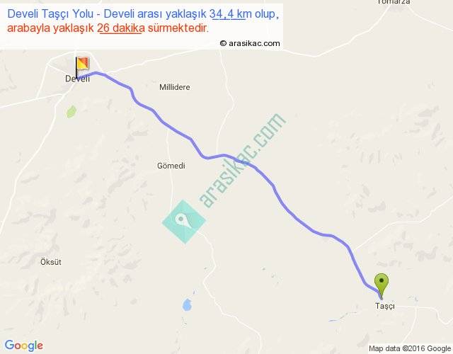 Develi Taşçı Yolu - Develi arası yaklaşık olarak 90 km/h ile yukarıda belirtilen sürede olup, iki yerin kuş uçuşu uzaklığı (mesafesi) 32'dir. Yolculuk otobüsle 33 dakika sürmektedir.