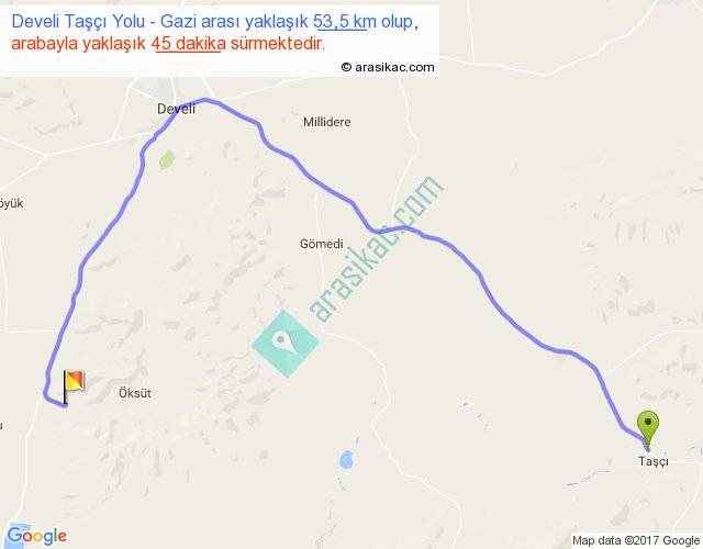 Develi Taşçı Yolu - Gazi arası yaklaşık olarak 90 km/h ile yukarıda belirtilen sürede olup, iki yerin kuş uçuşu uzaklığı (mesafesi) 32'dir. Yolculuk otobüsle 58 dakika sürmektedir.