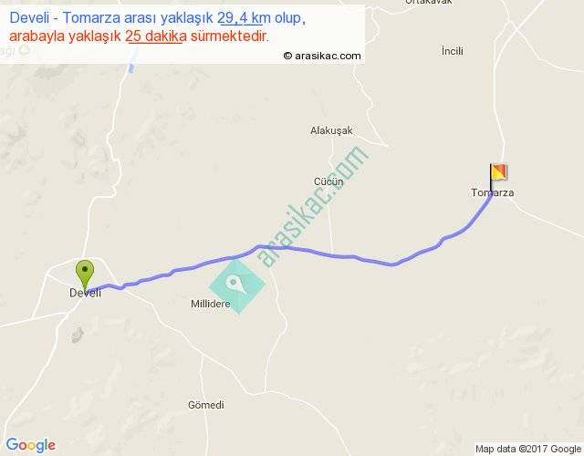 Develi - Tomarza arası yaklaşık olarak 90 km/h ile yukarıda belirtilen sürede olup, iki yerin kuş uçuşu uzaklığı (mesafesi) 27'dir. Yolculuk otobüsle 31 dakika sürmektedir.