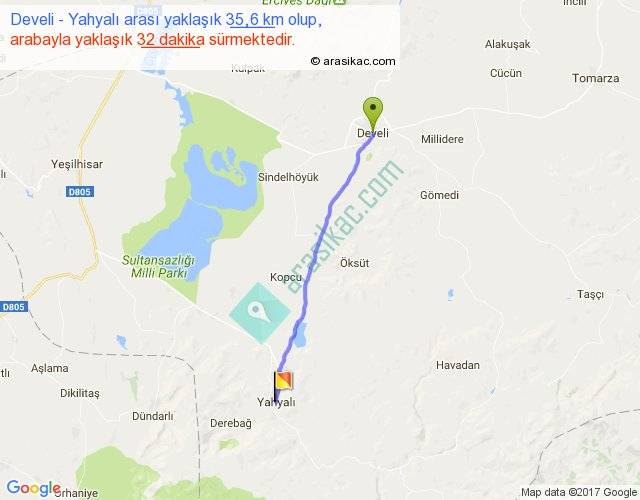 Develi - Yahyalı arası yaklaşık olarak 90 km/h ile yukarıda belirtilen sürede olup, iki yerin kuş uçuşu uzaklığı (mesafesi) 34'dir. Yolculuk otobüsle 41 dakika sürmektedir.