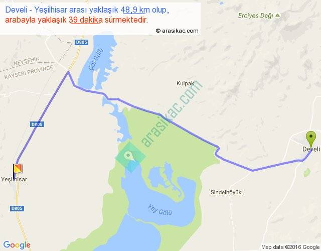 Develi - Yeşilhisar arası yaklaşık olarak 90 km/h ile yukarıda belirtilen sürede olup, iki yerin kuş uçuşu uzaklığı (mesafesi) 35'dir. Yolculuk otobüsle 50 dakika sürmektedir.