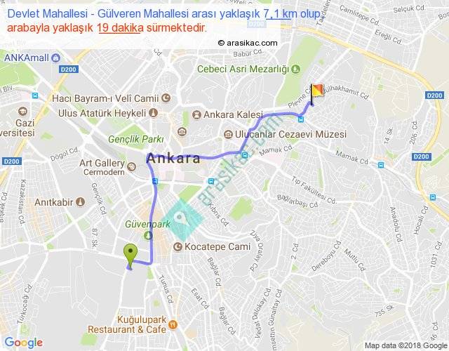 Devlet Mahallesi - Gülveren Mahallesi arası yaklaşık olarak 90 km/h ile yukarıda belirtilen sürede olup, iki yerin kuş uçuşu uzaklığı (mesafesi) 5'dir. Yolculuk otobüsle 24 dakika sürmektedir.