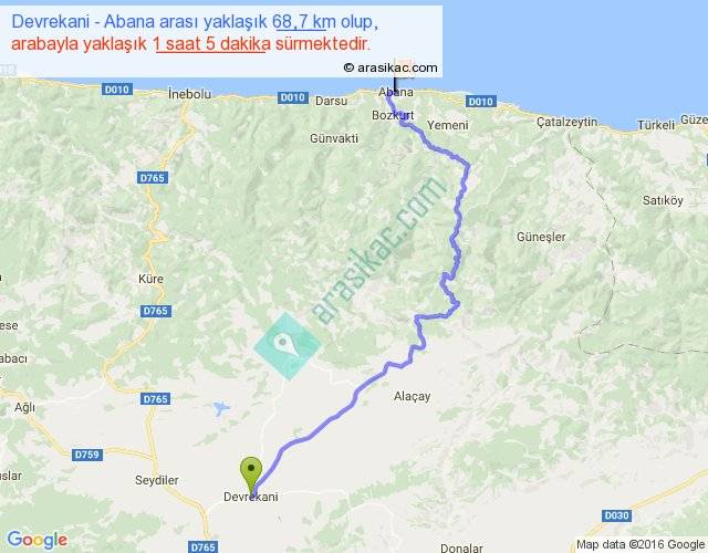 Devrekani - Abana arası yaklaşık olarak 90 km/h ile yukarıda belirtilen sürede olup, iki yerin kuş uçuşu uzaklığı (mesafesi) 44'dir. Yolculuk otobüsle 1 saat 24 dakika sürmektedir.