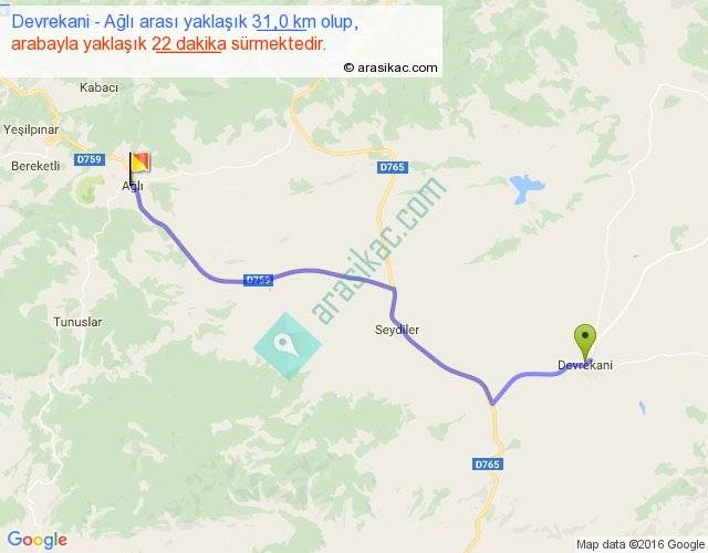 Devrekani - Ağlı arası yaklaşık olarak 90 km/h ile yukarıda belirtilen sürede olup, iki yerin kuş uçuşu uzaklığı (mesafesi) 25'dir. Yolculuk otobüsle 28 dakika sürmektedir.