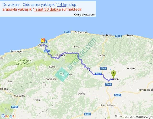 Devrekani - Cide arası yaklaşık olarak 90 km/h ile yukarıda belirtilen sürede olup, iki yerin kuş uçuşu uzaklığı (mesafesi) 76'dir. Yolculuk otobüsle 2 saat 4 dakika sürmektedir.