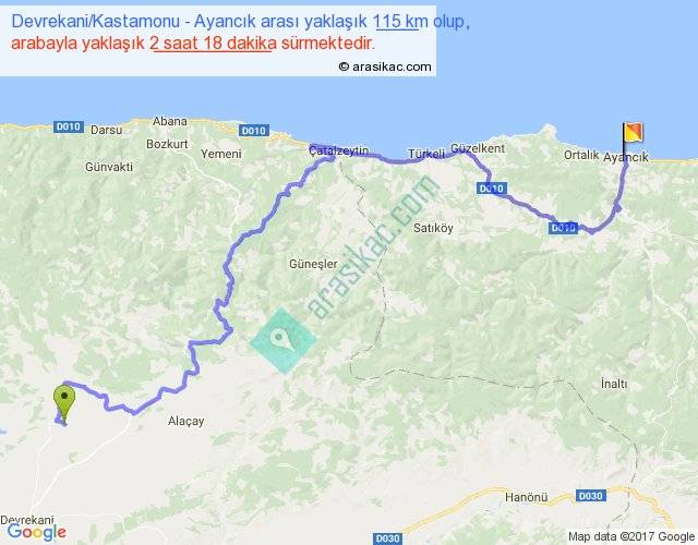 Devrekani Kastamonu - Ayancık arası yaklaşık olarak 90 km/h ile yukarıda belirtilen sürede olup, iki yerin kuş uçuşu uzaklığı (mesafesi) 65'dir. Yolculuk otobüsle 2 saat 59 dakika sürmektedir.