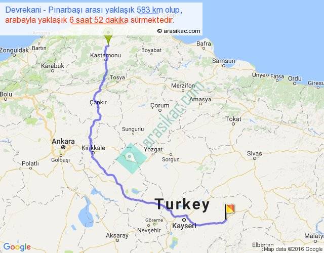Devrekani - Pınarbaşı arası yaklaşık olarak 90 km/h ile yukarıda belirtilen sürede olup, iki yerin kuş uçuşu uzaklığı (mesafesi) 385'dir. Eğer belirtilen yerler arasında uçak seferi var ise bu süre uçakla 35 dakika'ya kadar düşebilir. Yolculuk otobüsle 8 saat 55 dakika sürmektedir.