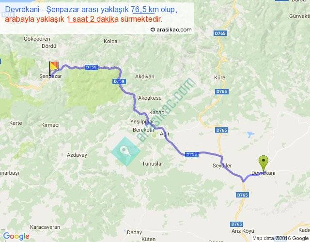 Devrekani - Şenpazar arası yaklaşık olarak 90 km/h ile yukarıda belirtilen sürede olup, iki yerin kuş uçuşu uzaklığı (mesafesi) 55'dir. Yolculuk otobüsle 1 saat 20 dakika sürmektedir.