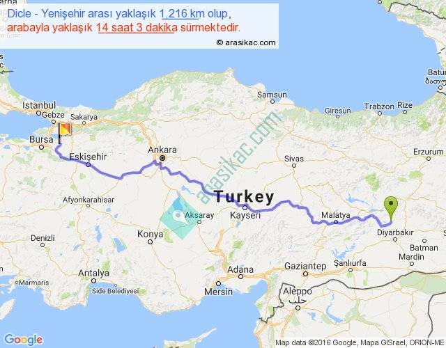 Dicle - Yenişehir arası yaklaşık olarak 90 km/h ile yukarıda belirtilen sürede olup, iki yerin kuş uçuşu uzaklığı (mesafesi) 915'dir. Eğer belirtilen yerler arasında uçak seferi var ise bu süre uçakla 1 saat 24 dakika'ya kadar düşebilir. Yolculuk otobüsle 18 saat 15 dakika sürmektedir.