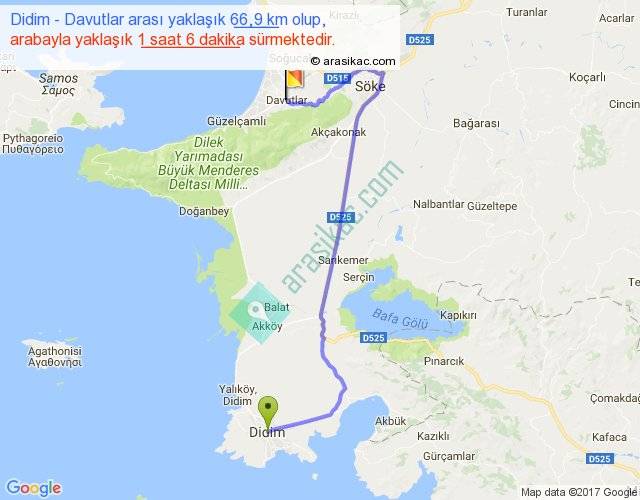 Didim - Davutlar arası yaklaşık olarak 90 km/h ile yukarıda belirtilen sürede olup, iki yerin kuş uçuşu uzaklığı (mesafesi) 40'dir. Yolculuk otobüsle 1 saat 25 dakika sürmektedir.