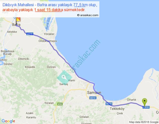 Dikbıyık Mahallesi - Bafra arası yaklaşık olarak 90 km/h ile yukarıda belirtilen sürede olup, iki yerin kuş uçuşu uzaklığı (mesafesi) 70'dir. Yolculuk otobüsle 1 saat 37 dakika sürmektedir.