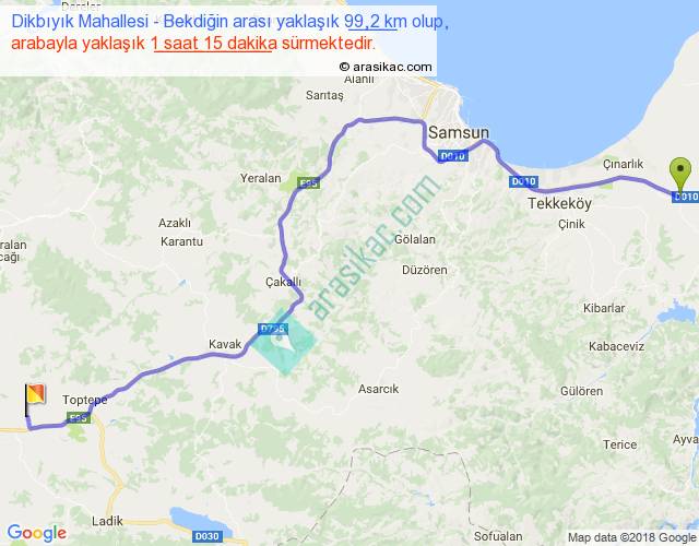 Dikbıyık Mahallesi - Bekdiğin arası yaklaşık olarak 90 km/h ile yukarıda belirtilen sürede olup, iki yerin kuş uçuşu uzaklığı (mesafesi) 72'dir. Yolculuk otobüsle 1 saat 37 dakika sürmektedir.