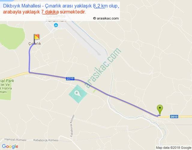 Dikbıyık Mahallesi - Çınarlık arası yaklaşık olarak 90 km/h ile yukarıda belirtilen sürede olup, iki yerin kuş uçuşu uzaklığı (mesafesi) 7'dir. Yolculuk otobüsle 9 dakika sürmektedir.