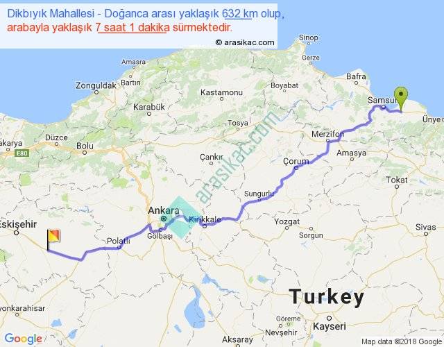 Dikbıyık Mahallesi - Doğanca arası yaklaşık olarak 90 km/h ile yukarıda belirtilen sürede olup, iki yerin kuş uçuşu uzaklığı (mesafesi) 505'dir. Eğer belirtilen yerler arasında uçak seferi var ise bu süre uçakla 46 dakika'ya kadar düşebilir. Yolculuk otobüsle 9 saat 7 dakika sürmektedir.