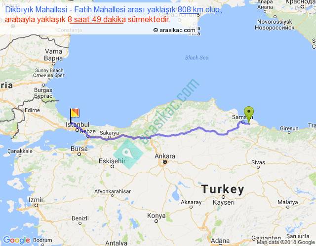 Dikbıyık Mahallesi - Fatih Mahallesi arası yaklaşık olarak 90 km/h ile yukarıda belirtilen sürede olup, iki yerin kuş uçuşu uzaklığı (mesafesi) 658'dir. Eğer belirtilen yerler arasında uçak seferi var ise bu süre uçakla 1 saat 00 dakika'ya kadar düşebilir. Yolculuk otobüsle 11 saat 27 dakika sürmektedir.