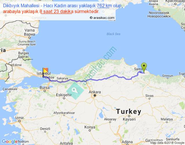 Dikbıyık Mahallesi - Hacı Kadın arası yaklaşık olarak 90 km/h ile yukarıda belirtilen sürede olup, iki yerin kuş uçuşu uzaklığı (mesafesi) 638'dir. Eğer belirtilen yerler arasında uçak seferi var ise bu süre uçakla 58 dakika'ya kadar düşebilir. Yolculuk otobüsle 10 saat 53 dakika sürmektedir.
