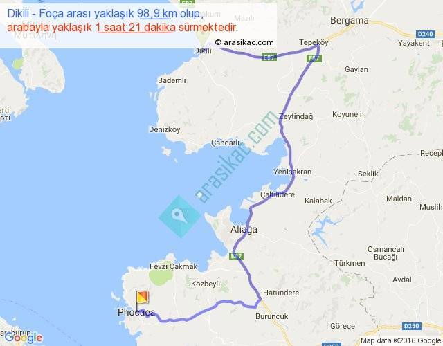 Dikili - Foça arası yaklaşık olarak 90 km/h ile yukarıda belirtilen sürede olup, iki yerin kuş uçuşu uzaklığı (mesafesi) 46'dir. Yolculuk otobüsle 1 saat 45 dakika sürmektedir.