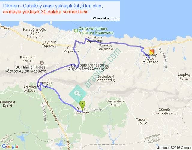 Dikmen - Çatalköy arası yaklaşık olarak 90 km/h ile yukarıda belirtilen sürede olup, iki yerin kuş uçuşu uzaklığı (mesafesi) 9'dir. Yolculuk otobüsle 39 dakika sürmektedir.
