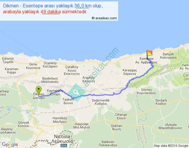 Dikmen - Esentepe arası yaklaşık olarak 90 km/h ile yukarıda belirtilen sürede olup, iki yerin kuş uçuşu uzaklığı (mesafesi) 24'dir. Yolculuk otobüsle 1 saat 3 dakika sürmektedir.