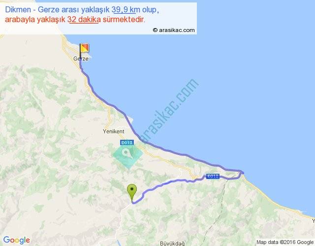 Dikmen - Gerze arası yaklaşık olarak 90 km/h ile yukarıda belirtilen sürede olup, iki yerin kuş uçuşu uzaklığı (mesafesi) 18'dir. Yolculuk otobüsle 41 dakika sürmektedir.