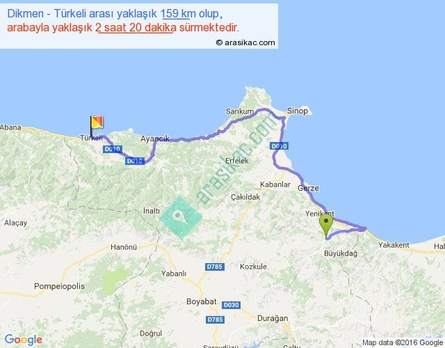 Dikmen - Türkeli arası yaklaşık olarak 90 km/h ile yukarıda belirtilen sürede olup, iki yerin kuş uçuşu uzaklığı (mesafesi) 83'dir. Yolculuk otobüsle 3 saat 3 dakika sürmektedir.