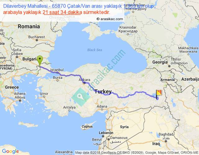 Dilaverbey Mahallesi - 65870 Çatak Van arası yaklaşık olarak 90 km/h ile yukarıda belirtilen sürede olup, iki yerin kuş uçuşu uzaklığı (mesafesi) 1453'dir. Eğer belirtilen yerler arasında uçak seferi var ise bu süre uçakla 2 saat 14 dakika'ya kadar düşebilir. Yolculuk otobüsle 1 gün 4 saat sürmektedir.