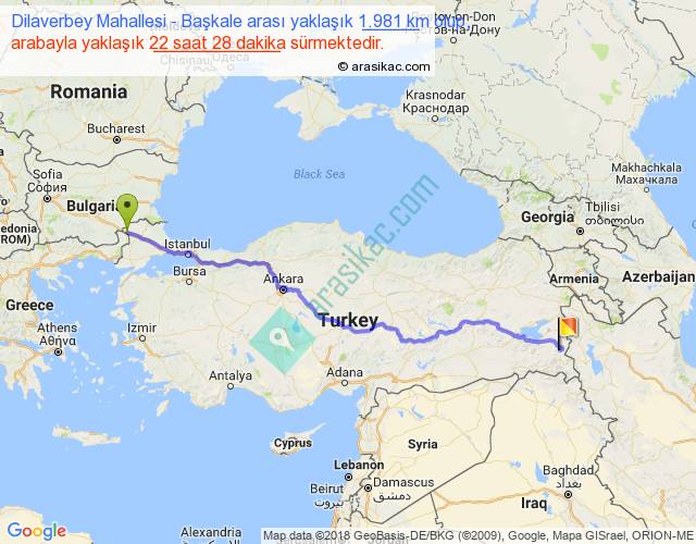 Dilaverbey Mahallesi - Başkale arası yaklaşık olarak 90 km/h ile yukarıda belirtilen sürede olup, iki yerin kuş uçuşu uzaklığı (mesafesi) 1532'dir. Eğer belirtilen yerler arasında uçak seferi var ise bu süre uçakla 2 saat 21 dakika'ya kadar düşebilir. Yolculuk otobüsle 1 gün 5 saat sürmektedir.