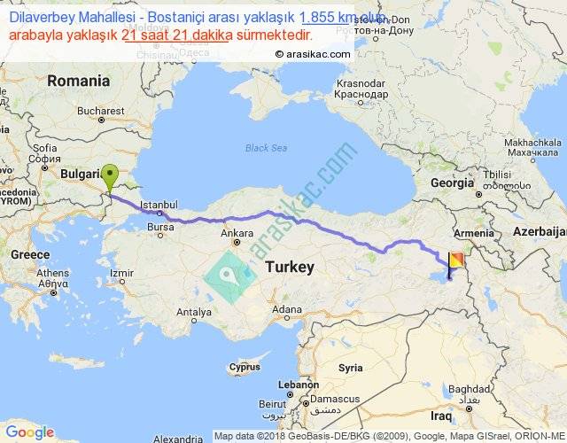 Dilaverbey Mahallesi - Bostaniçi arası yaklaşık olarak 90 km/h ile yukarıda belirtilen sürede olup, iki yerin kuş uçuşu uzaklığı (mesafesi) 1467'dir. Eğer belirtilen yerler arasında uçak seferi var ise bu süre uçakla 2 saat 15 dakika'ya kadar düşebilir. Yolculuk otobüsle 1 gün 3 saat sürmektedir.