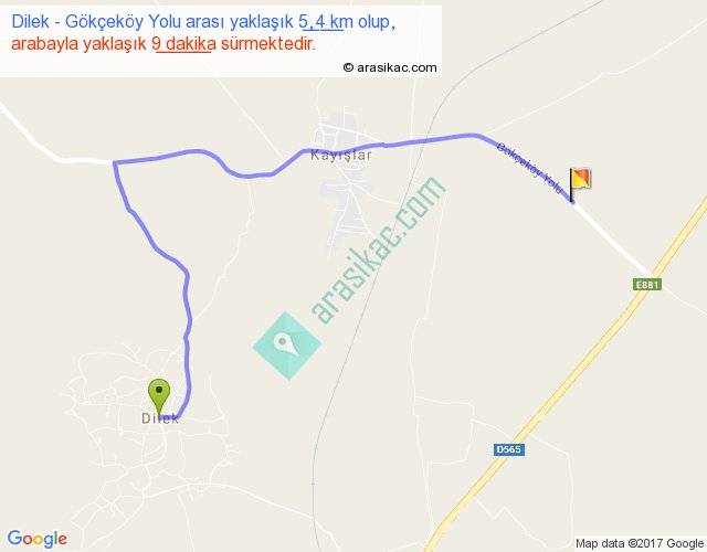 Dilek - Gökçeköy Yolu arası yaklaşık olarak 90 km/h ile yukarıda belirtilen sürede olup, iki yerin kuş uçuşu uzaklığı (mesafesi) 3'dir. Yolculuk otobüsle 11 dakika sürmektedir.