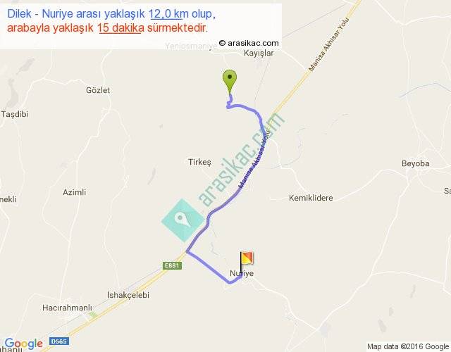 Dilek - Nuriye arası yaklaşık olarak 90 km/h ile yukarıda belirtilen sürede olup, iki yerin kuş uçuşu uzaklığı (mesafesi) 8'dir. Yolculuk otobüsle 19 dakika sürmektedir.