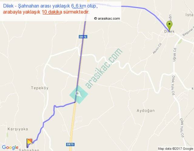 Dilek - Şahnahan arası yaklaşık olarak 90 km/h ile yukarıda belirtilen sürede olup, iki yerin kuş uçuşu uzaklığı (mesafesi) 5'dir. Yolculuk otobüsle 13 dakika sürmektedir.