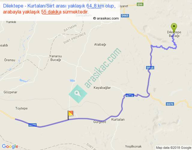 Dilektepe - Kurtalan Siirt arası yaklaşık olarak 90 km/h ile yukarıda belirtilen sürede olup, iki yerin kuş uçuşu uzaklığı (mesafesi) 27'dir. Yolculuk otobüsle 1 saat 11 dakika sürmektedir.