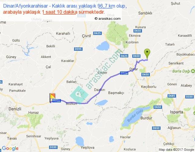 Dinar Afyonkarahisar - Kaklık arası yaklaşık olarak 90 km/h ile yukarıda belirtilen sürede olup, iki yerin kuş uçuşu uzaklığı (mesafesi) 83'dir. Yolculuk otobüsle 1 saat 31 dakika sürmektedir.