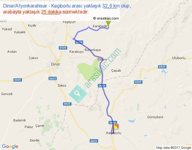 Dinar Afyonkarahisar - Keçiborlu arası yaklaşık olarak 90 km/h ile yukarıda belirtilen sürede olup, iki yerin kuş uçuşu uzaklığı (mesafesi) 21'dir. Yolculuk otobüsle 32 dakika sürmektedir.