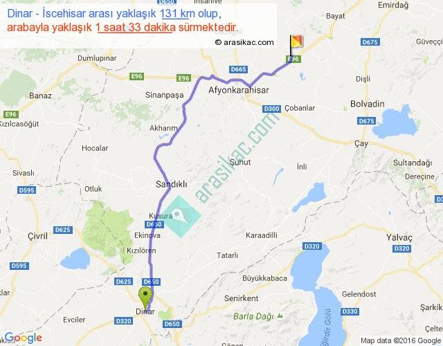 Dinar - İscehisar arası yaklaşık olarak 90 km/h ile yukarıda belirtilen sürede olup, iki yerin kuş uçuşu uzaklığı (mesafesi) 101'dir. Yolculuk otobüsle 2 saat 0 dakika sürmektedir.