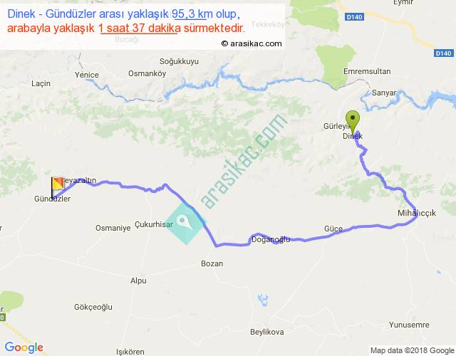 Dinek - Gündüzler arası yaklaşık olarak 90 km/h ile yukarıda belirtilen sürede olup, iki yerin kuş uçuşu uzaklığı (mesafesi) 50'dir. Yolculuk otobüsle 2 saat 6 dakika sürmektedir.