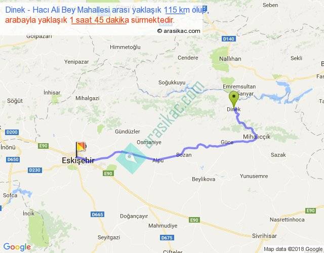 Dinek - Hacı Ali Bey Mahallesi arası yaklaşık olarak 90 km/h ile yukarıda belirtilen sürede olup, iki yerin kuş uçuşu uzaklığı (mesafesi) 76'dir. Yolculuk otobüsle 2 saat 16 dakika sürmektedir.