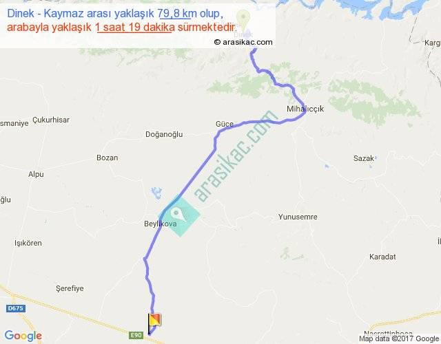 Dinek - Kaymaz arası yaklaşık olarak 90 km/h ile yukarıda belirtilen sürede olup, iki yerin kuş uçuşu uzaklığı (mesafesi) 53'dir. Yolculuk otobüsle 1 saat 42 dakika sürmektedir.