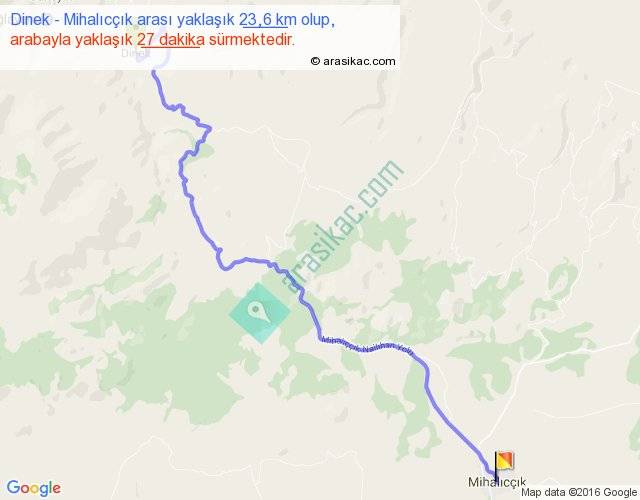 Dinek - Mihalıcçık arası yaklaşık olarak 90 km/h ile yukarıda belirtilen sürede olup, iki yerin kuş uçuşu uzaklığı (mesafesi) 16'dir. Yolculuk otobüsle 35 dakika sürmektedir.