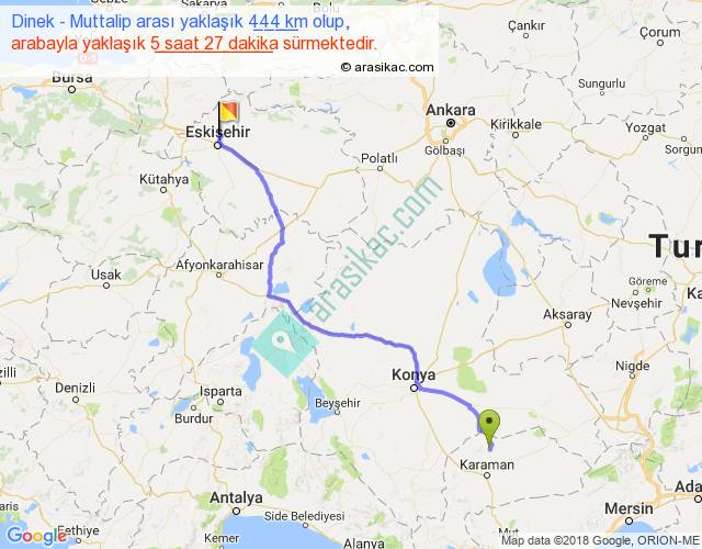 Dinek - Muttalip arası yaklaşık olarak 90 km/h ile yukarıda belirtilen sürede olup, iki yerin kuş uçuşu uzaklığı (mesafesi) 357'dir. Eğer belirtilen yerler arasında uçak seferi var ise bu süre uçakla 32 dakika'ya kadar düşebilir. Yolculuk otobüsle 7 saat 5 dakika sürmektedir.