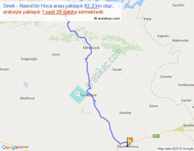 Dinek - Nasrettin Hoca arası yaklaşık olarak 90 km/h ile yukarıda belirtilen sürede olup, iki yerin kuş uçuşu uzaklığı (mesafesi) 56'dir. Yolculuk otobüsle 1 saat 51 dakika sürmektedir.