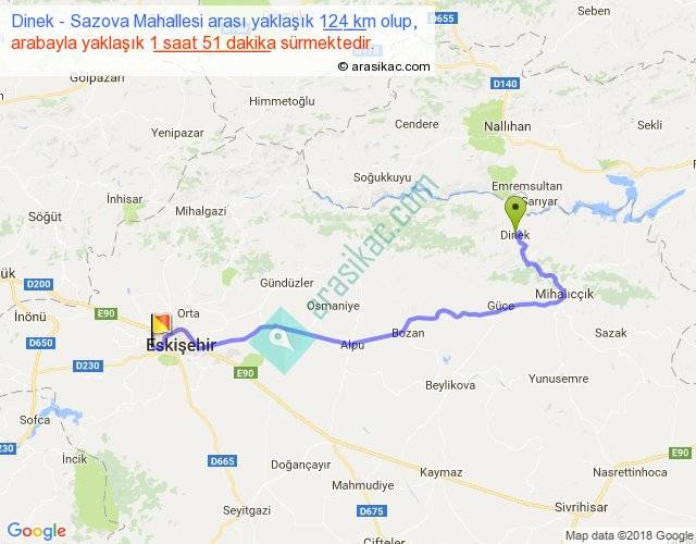 Dinek - Sazova Mahallesi arası yaklaşık olarak 90 km/h ile yukarıda belirtilen sürede olup, iki yerin kuş uçuşu uzaklığı (mesafesi) 81'dir. Yolculuk otobüsle 2 saat 24 dakika sürmektedir.