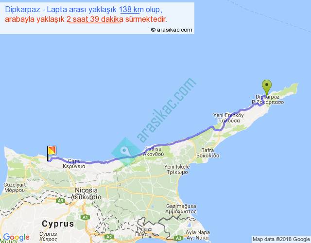 Dipkarpaz - Lapta arası yaklaşık olarak 90 km/h ile yukarıda belirtilen sürede olup, iki yerin kuş uçuşu uzaklığı (mesafesi) 116'dir. Yolculuk otobüsle 3 saat 26 dakika sürmektedir.
