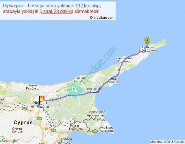 Dipkarpaz - Lefkoşa arası yaklaşık olarak 90 km/h ile yukarıda belirtilen sürede olup, iki yerin kuş uçuşu uzaklığı (mesafesi) 104'dir. Yolculuk otobüsle 3 saat 12 dakika sürmektedir.